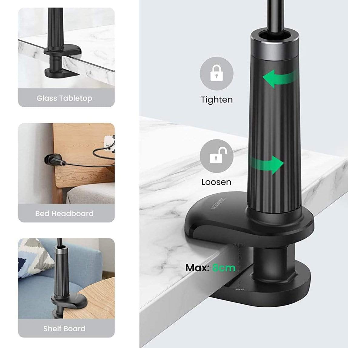 Adjustable: Depending on the thickness of the surface, the base clamp can be easily adjusted to fit any surface up to 8 cm thickness. Twist clockwise to tighten and anti-clockwise to loosen the grip.