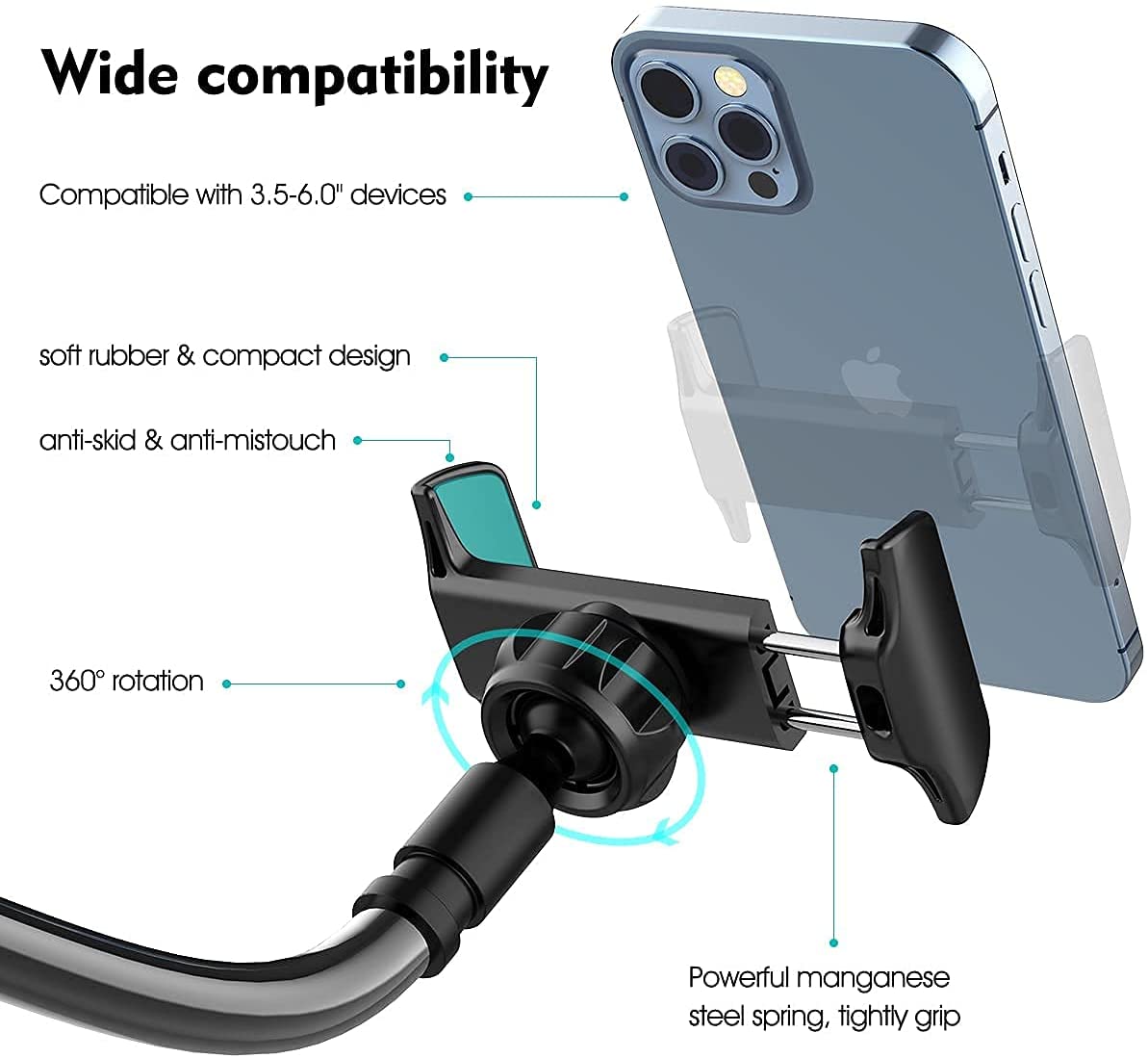 Wide Compatibility: This versatile phone holder can support all smartphones, phablets, tablets. The telescopic phone mount strongly holds your phone without leaving any scratch.