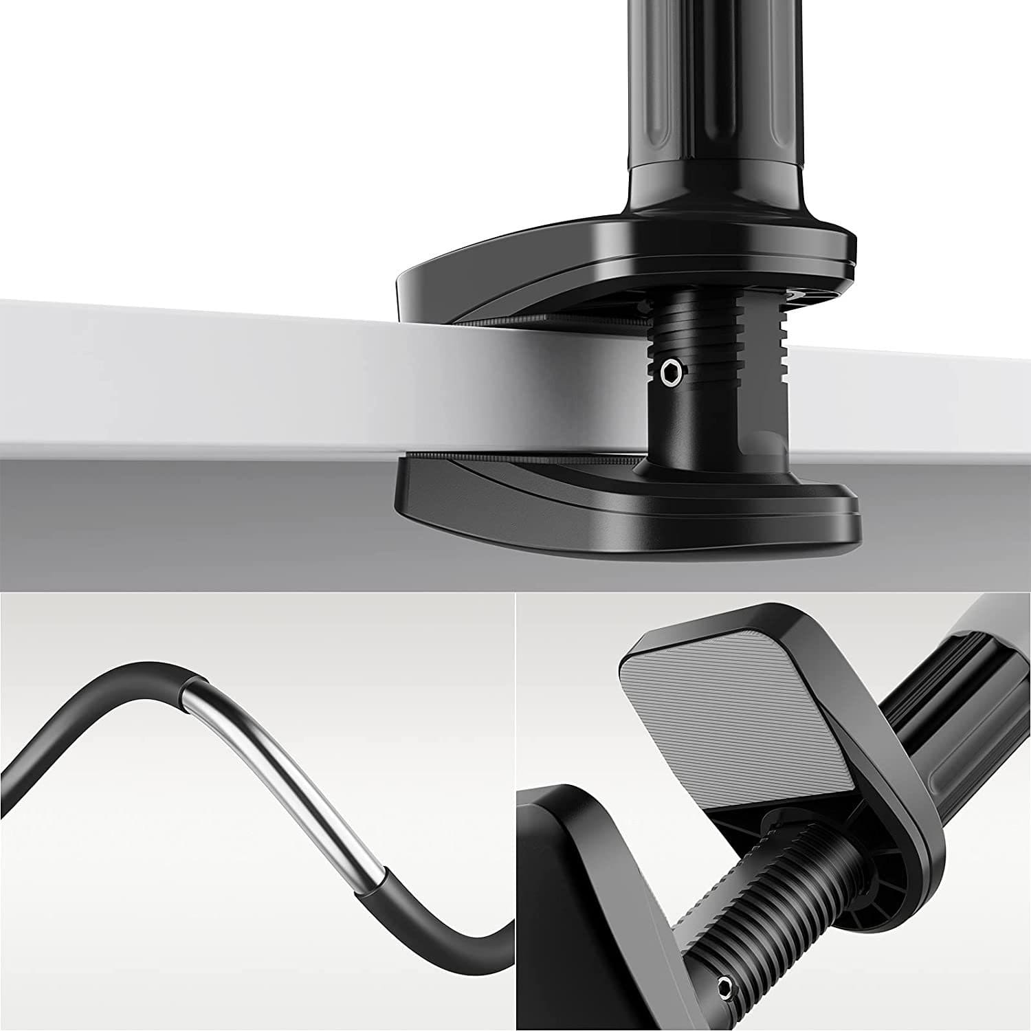 Easy to Use: Place the base clamp on a strong surface and twist the knob to tighten/loosen the clamp. The clamps are provided with anti-slip layers on both sides to avoid any damage to the holding surface.