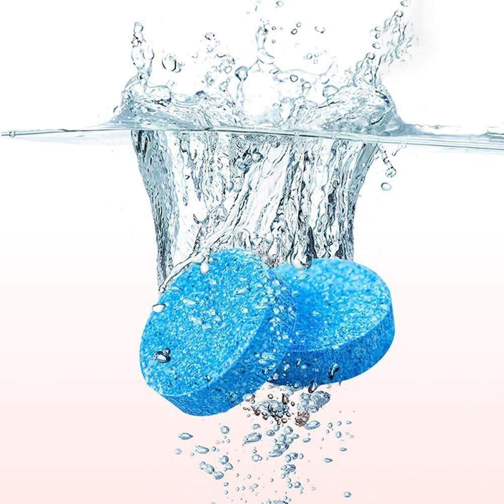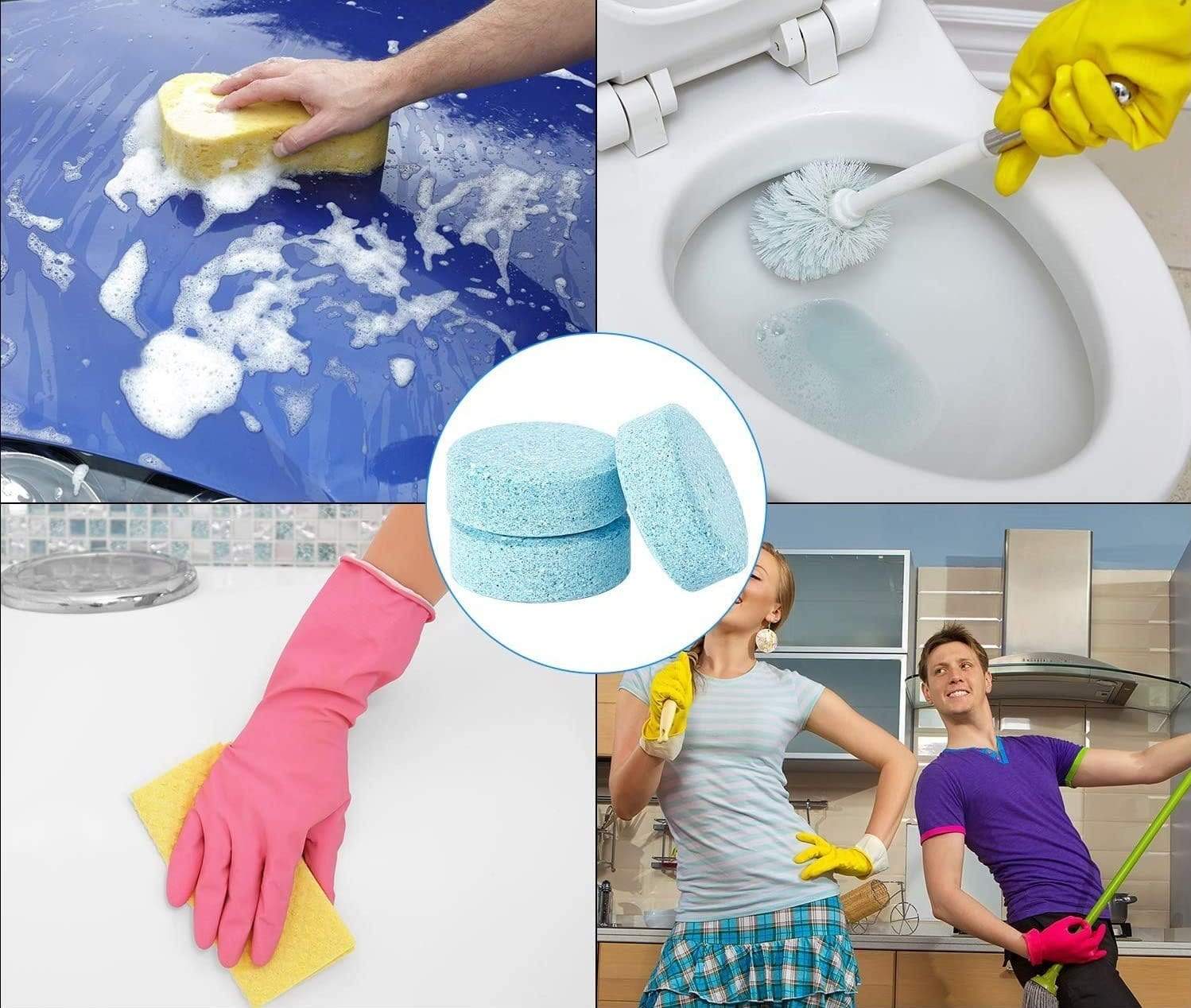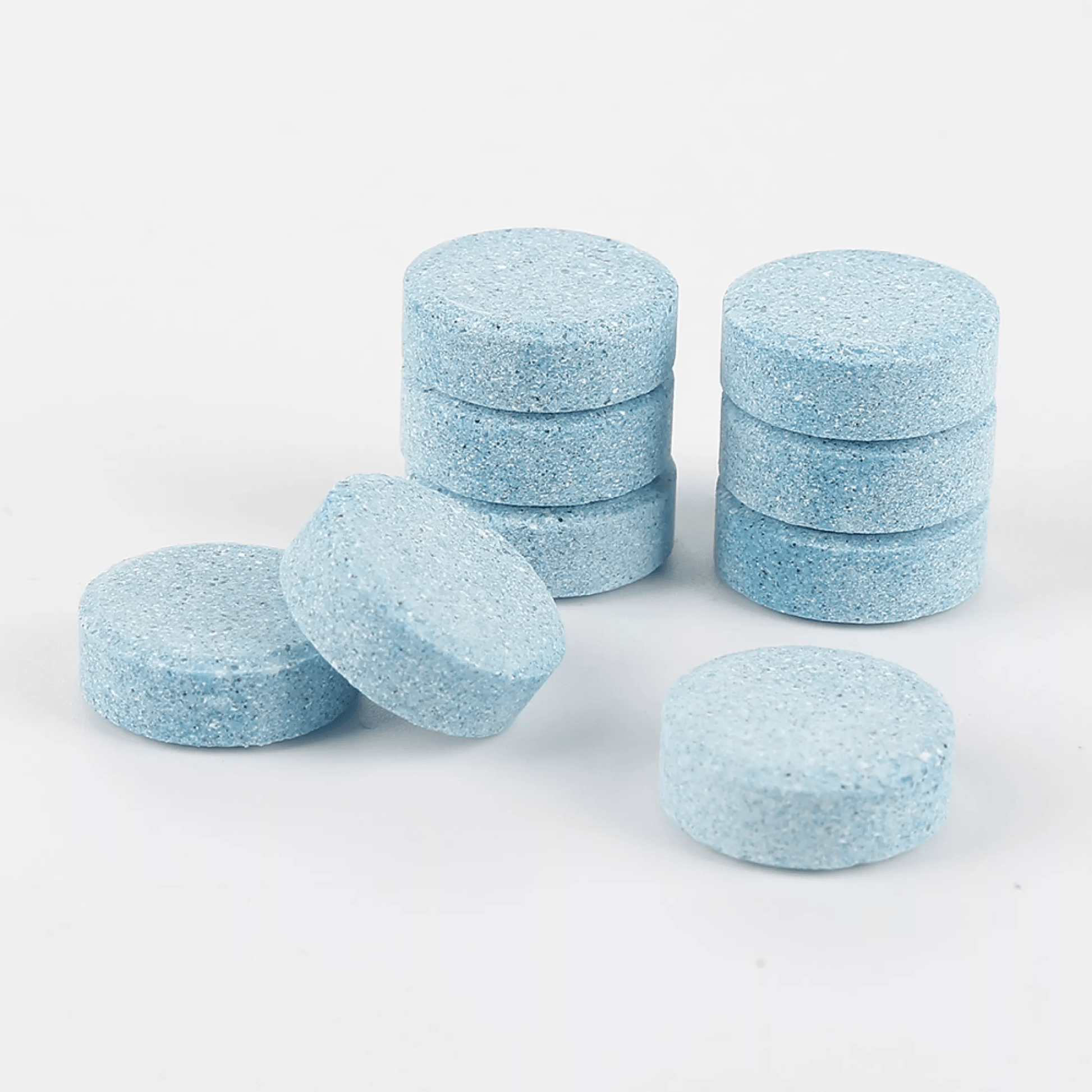 The powerful effervescence tablets dissolve quickly in water to form a blue-colored solution. The solution delivers a strong cleaning punch, effectively removing all the stubborn dirt, grease, and odor without any scrubbing!