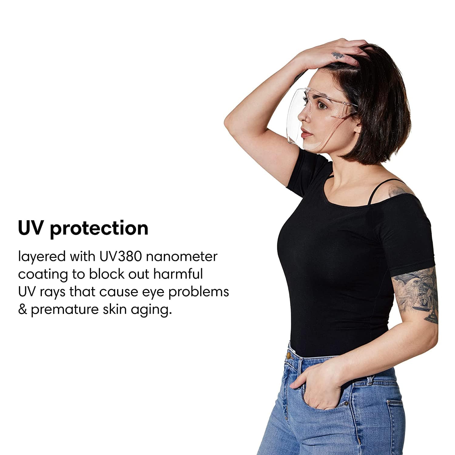 Shieldox™, a face shield in the shape of goggles that covers the entire face for extra protection against diseases and dust!! Shieldox™ is the latest & most comfortable way to protect the entire face from foreign particles. Equipped with an ergonomic nose pad and ear temples, they stay on just like ordinary goggles. Being light and transparent, you can wear them all day long without blocking your vision. It also provides protection against UV rays and polluted air.