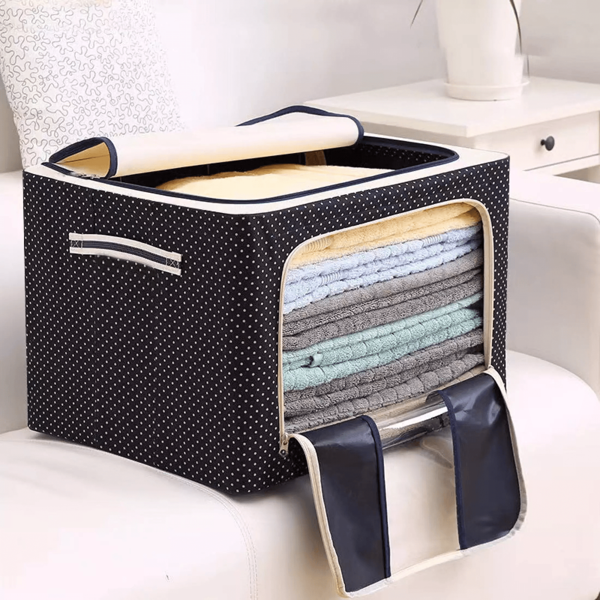 A wardrobe organizer box to store your out-of-season clothes and other items in an organized way. Stokzio™ can store anything like bulky winter clothes, sarees, blankets, curtains, bed linens, quilts, toys, books, etc. Perfect for cutting down on clutter, this storage organizer can easily fit your storage bed or almirah.